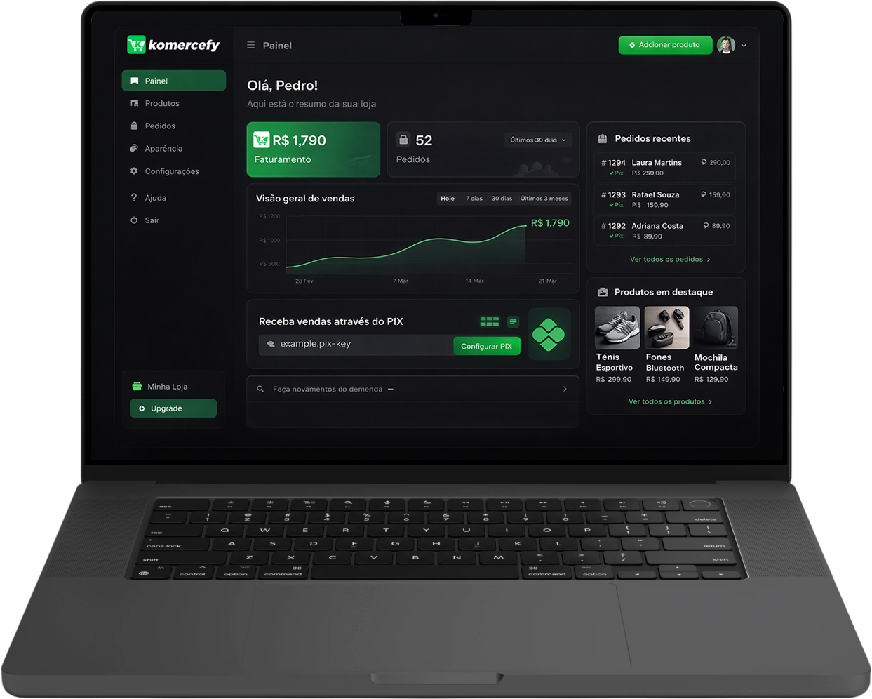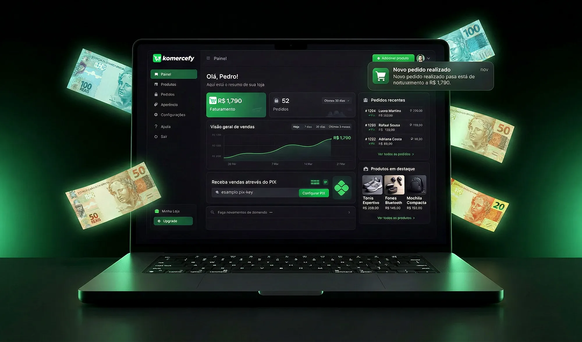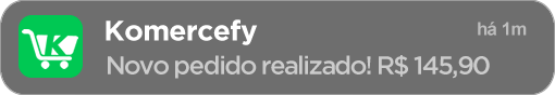 Sua loja fica pronta para receber pedidos e você acompanha tudo pelo painel da Komercefy.